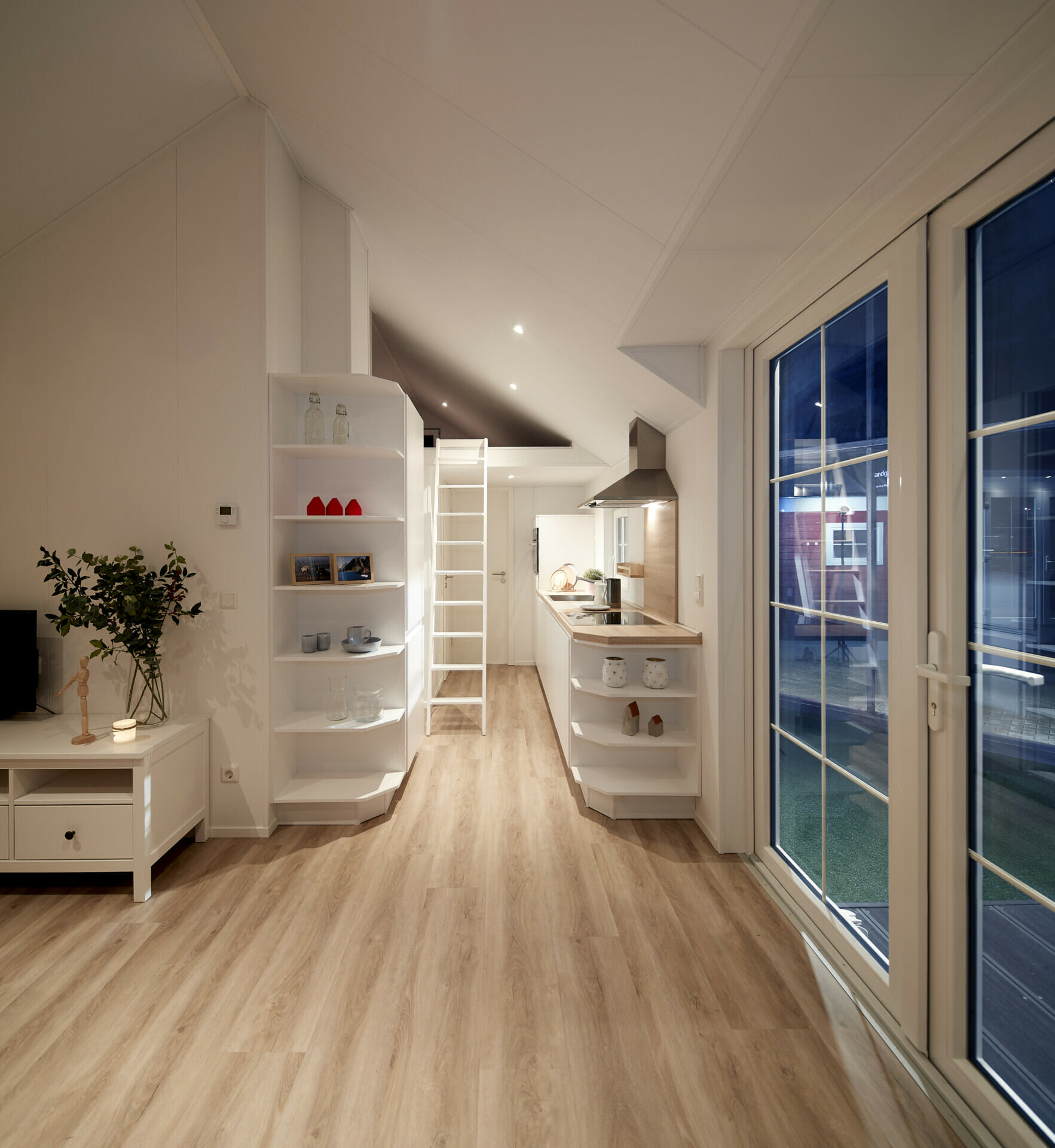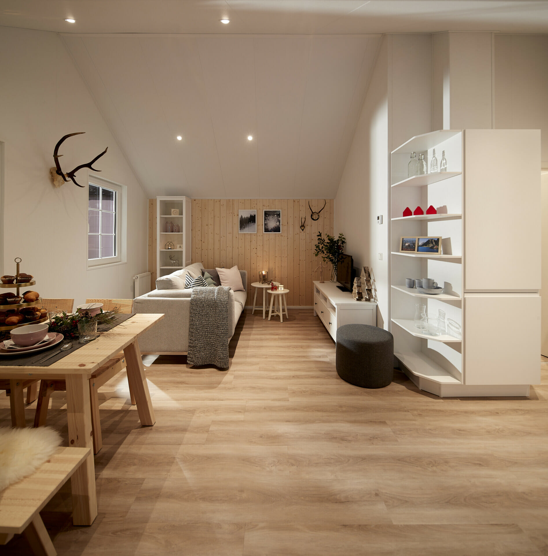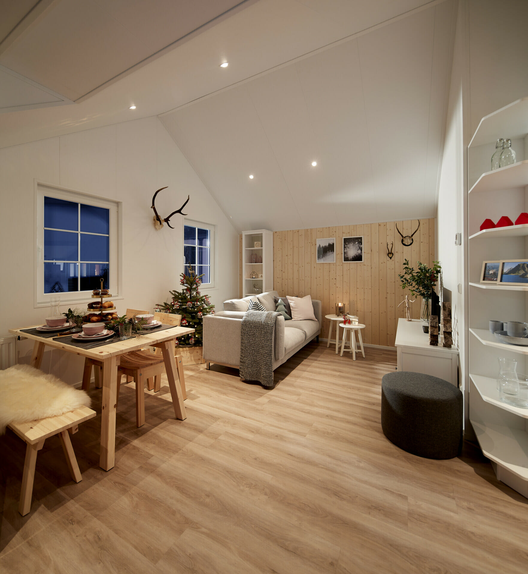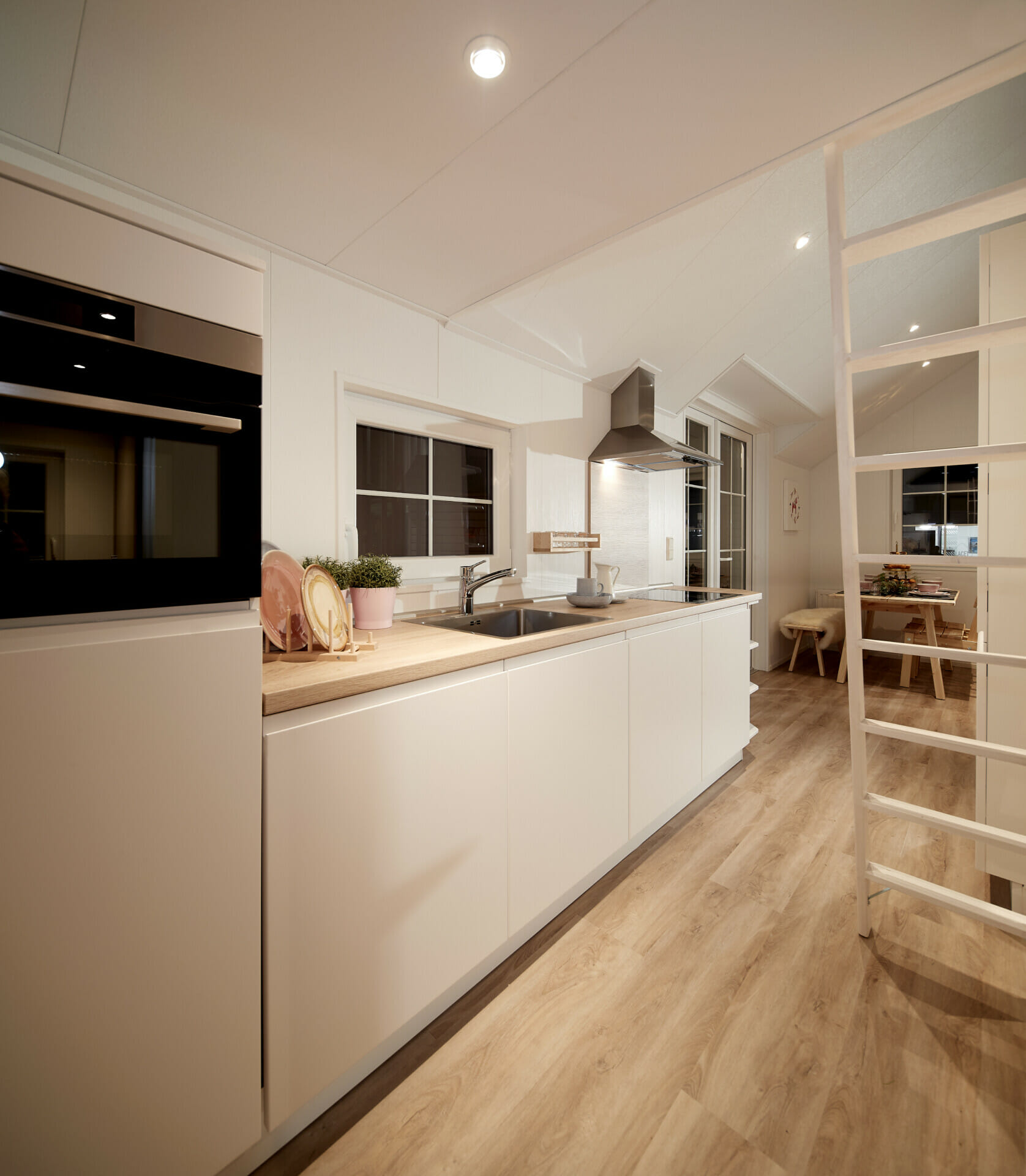 De LACET Falun brengt de typische charme van de Scandinavische wooncultuur naar de wereld van de stacaravans. Strakke lijnen, natuurlijke materialen en hoogwaardige afwerking creëren een exclusieve woonsfeer - ideaal voor gezinnen, stellen of als stijlvol toevluchtsoord. De buitenkant met echt houten lambrisering in verschillende dessins, schuiframen en een stevig schuin dak maken van de houten stacaravan een echte blikvanger. Ook binnen maakt het model indruk met lichtovergoten kamers, warme houttinten en een open woon- en eetruimte die uitnodigt om te blijven hangen met zijn rustige, uitnodigende ontwerp. De functionele keuken met moderne apparatuur, open rekken en wand- en onderkasten voldoet niet alleen aan de hoogste normen van functionaliteit, maar biedt ook veel opbergruimte.