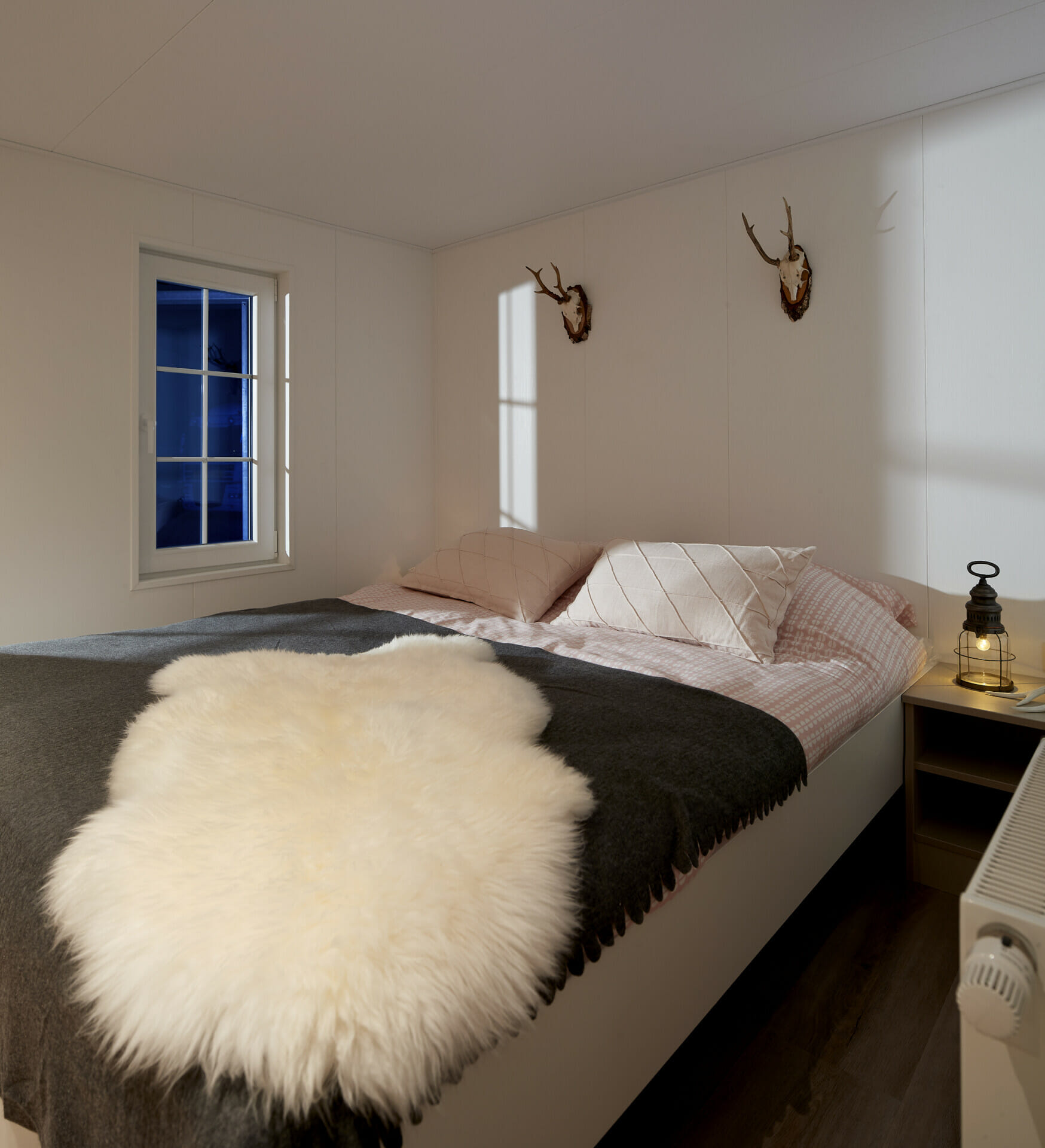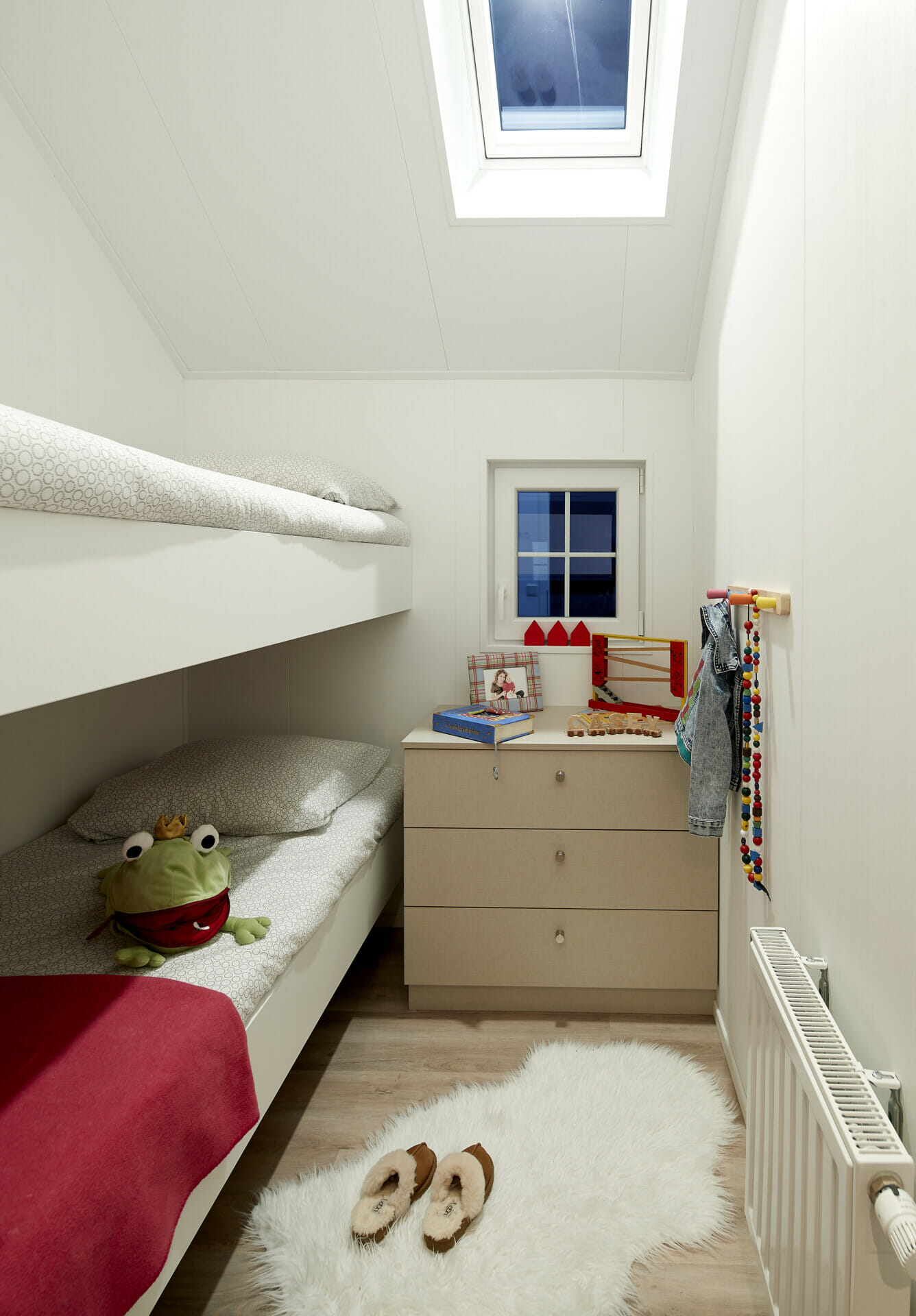 De slaapzolder is een hoogtepunt. Het is veelzijdig en kan worden gebruikt als toevluchtsoord, speelruimte of extra opslagruimte. Twee aparte slaapkamers bieden een toevluchtsoord: De ouderslaapkamer biedt een comfortabel tweepersoonsbed, terwijl de tweede kamer is uitgerust met geïntegreerde stapelbedden, waardoor het ideaal is voor gezinnen met kinderen. De robuuste constructie en efficiënte isolatie maken de Scandinavisch geïnspireerde stacaravan het hele jaar door bewoonbaar. Een modern verwarmingssysteem en energiezuinige thermisch isolerende ramen zorgen voor een aangenaam binnenklimaat.