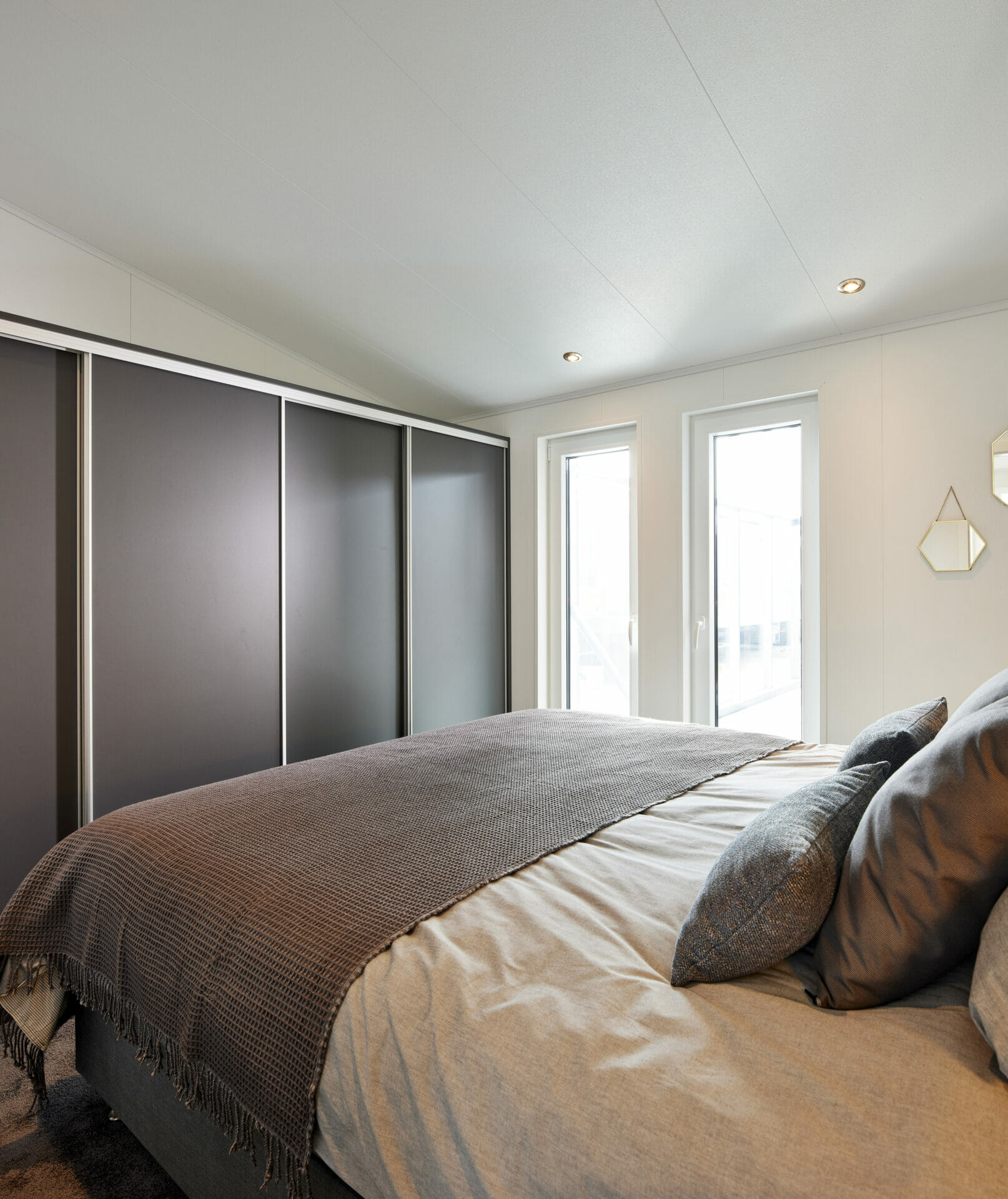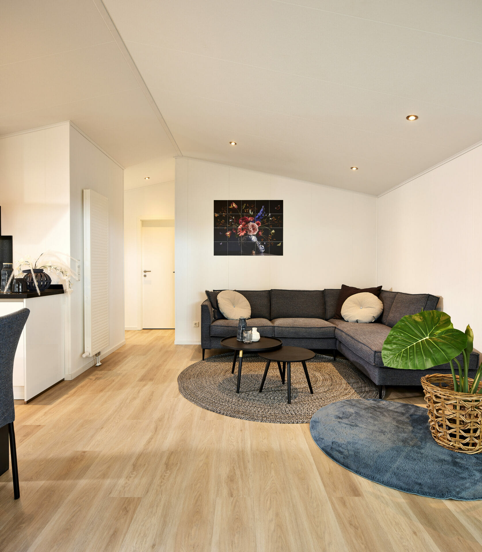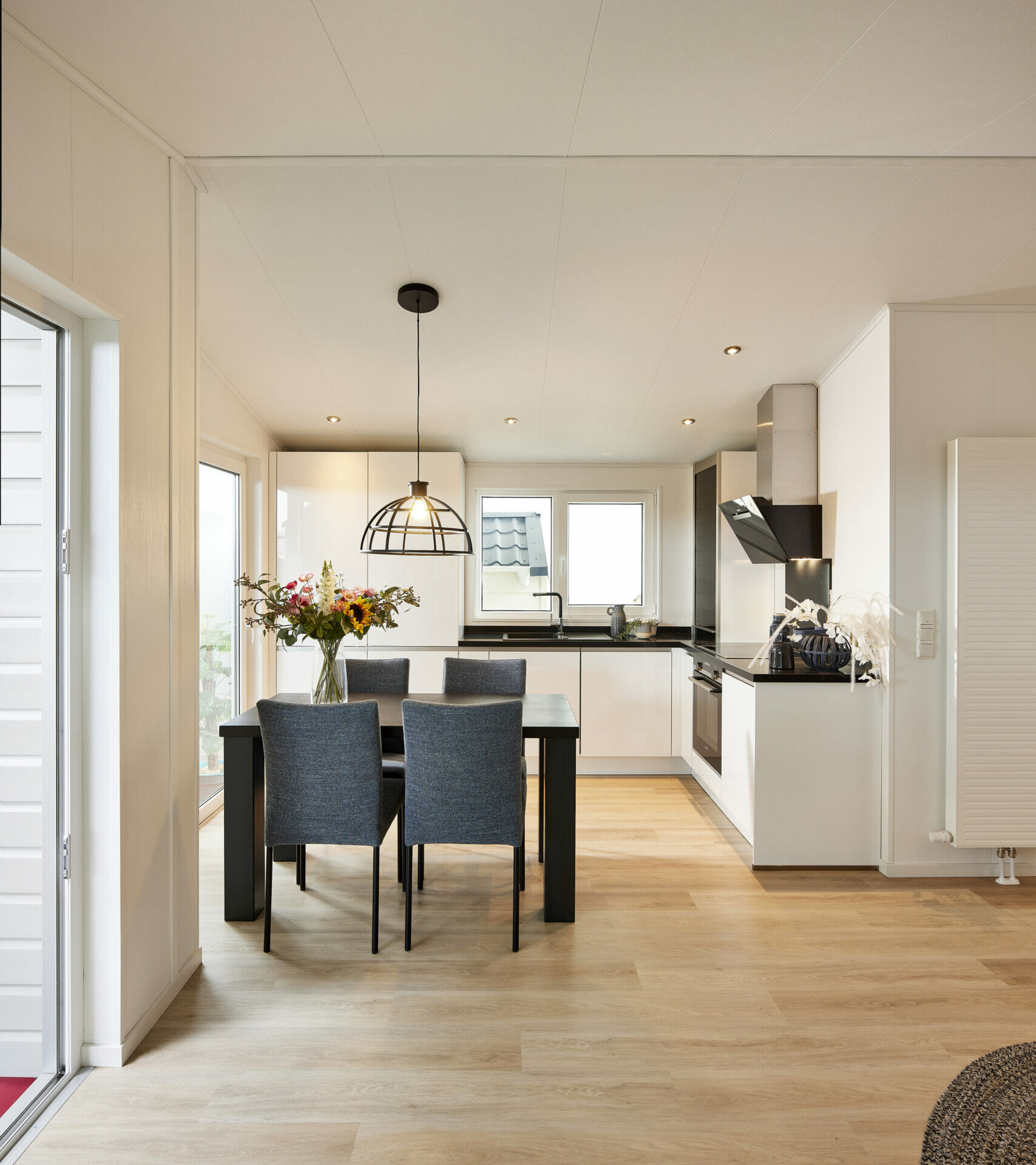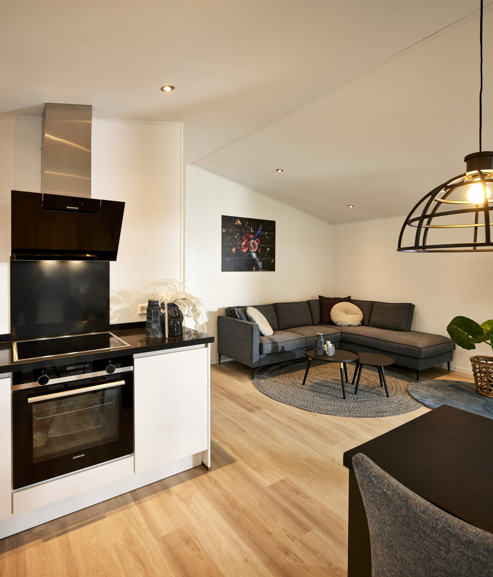 In het centrale woongedeelte smelten wonen, dineren en koken samen tot één ruimte die je uitnodigt om te genieten en te ontspannen. Hier kun je samen genieten van een diner of ontbijt met uitzicht op de buitenlucht. Kunststof ramen zorgen voor helderheid, terwijl het moderne interieur een gezellige sfeer creëert. De volledig uitgeruste keuken combineert hedendaags design met praktische functionaliteit: keramische kookplaat, ruime koel-vriescombinatie en oven voldoen aan alle comfortvereisten. Slimme opbergoplossingen en ruime werkoppervlakken maken het kookgedeelte perfect voor het dagelijks leven en vakanties.