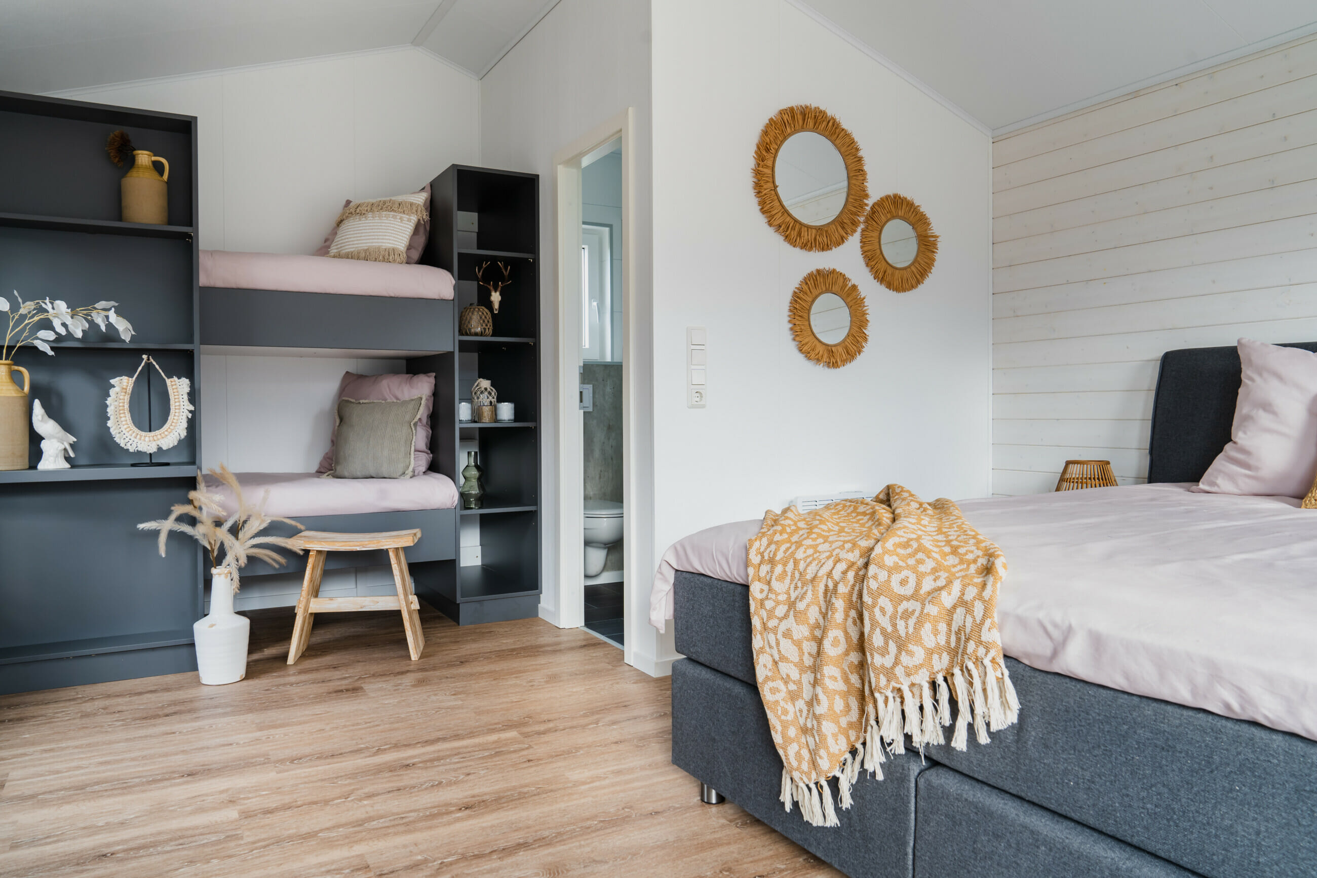 De open woon- en keukenruimte verrast door zijn ruimtelijkheid. Grote ramen laten veel licht binnen en creëren samen met de gezellige zithoek een uitnodigende sfeer - perfect voor ontbijt, spelletjesavonden of een korte pauze. De moderne keuken met onderhoudsvriendelijke klik vinylvloer, LED-verlichting en slimme opbergruimte maakt koken een plezier, zelfs in een kleine ruimte. De LACET Mulia stacaravan laat zich ook van zijn doordachte kant zien in de privéruimtes: In de ouderslaapkamer zorgt een knus bed met hoogwaardige matrassen voor ontspannen nachten, terwijl open rekken en een ruimtebesparende kastoplossing voor veel opbergruimte zorgen. Het tweede slaapgedeelte met een stevig stapelbed is ideaal voor kinderen of vrienden en maakt optimaal gebruik van de beschikbare ruimte - inclusief slim geïntegreerde opbergmogelijkheden. De moderne badkamer grenst er direct aan en past harmonieus in het totaalconcept. Ondanks de compacte afmetingen biedt het alles wat gasten nodig hebben voor het dagelijks leven met een comfortabele douche (90 × 90 cm), een elegante wastafel, hangend toilet en wandpanelen in tegellook van hoge kwaliteit. Een verlichte spiegelkast maakt de stijlvolle en functionele ambiance compleet. Het totaalconcept wordt afgerond door 100 mm isolatie, een krachtig verwarmingssysteem en een solide constructie, waardoor de Mulia een stacaravan is die het hele jaar door gebruikt kan worden en ook op de lange termijn zijn waarde behoudt.