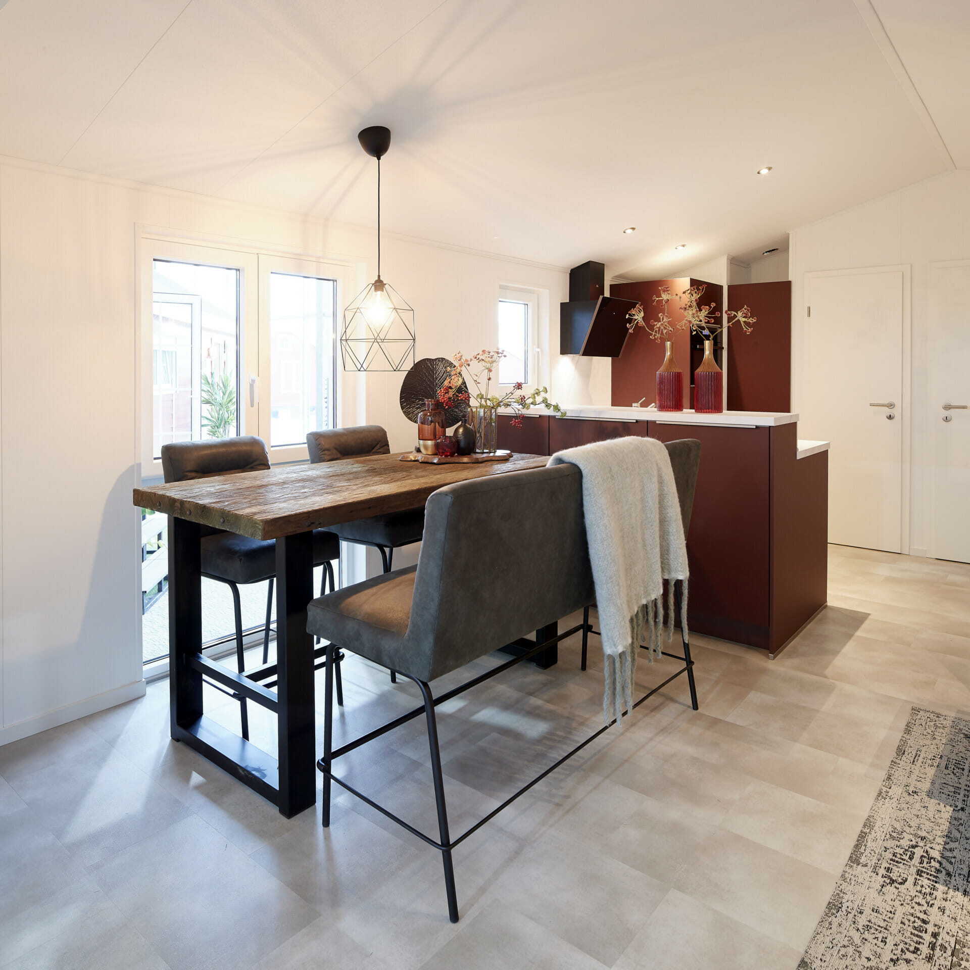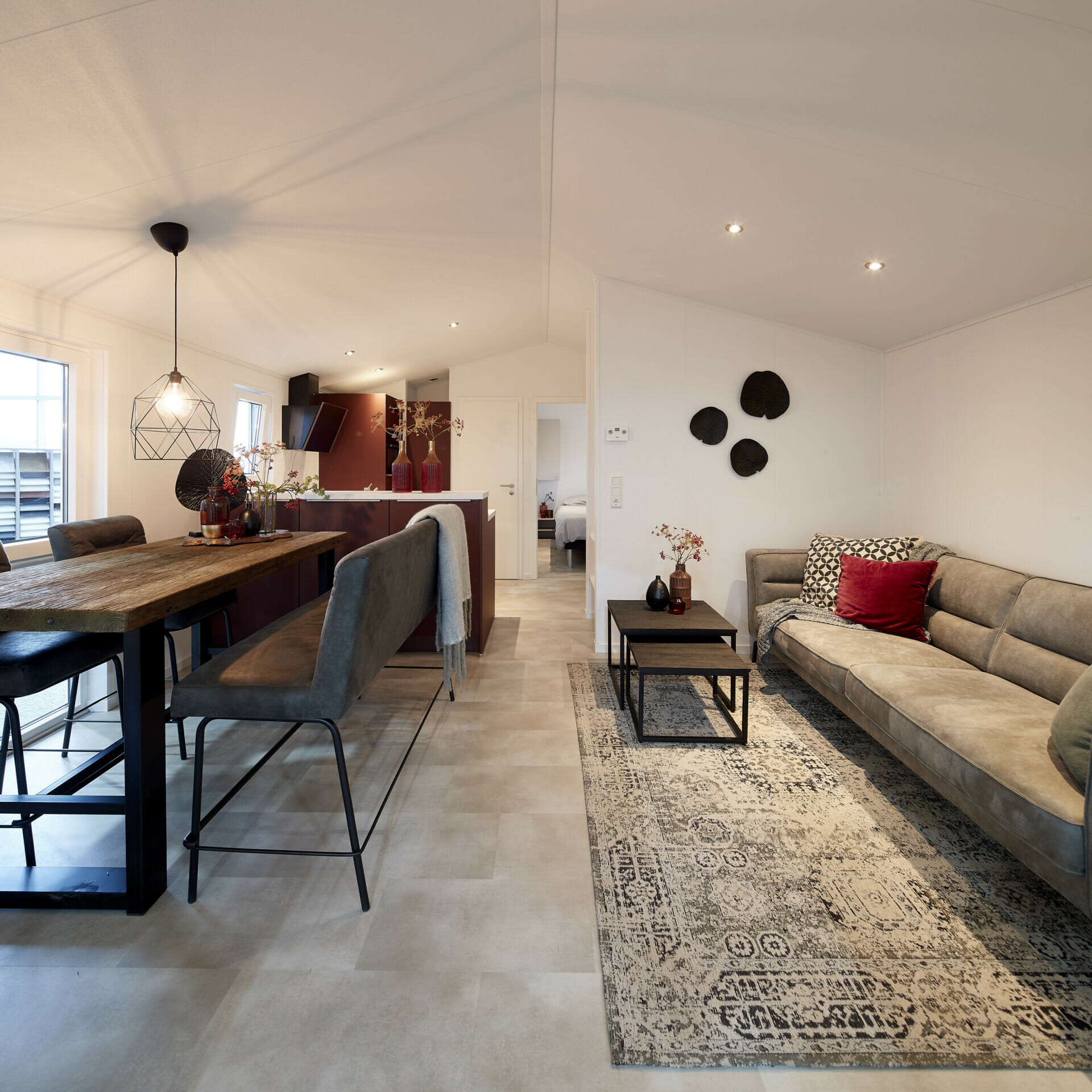De open woon- en eetruimte vormt het hart van dit model: heldere lijnen, warme kleuren en hoogwaardig meubilair creëren een uitnodigende sfeer. De royaal ontworpen keuken met afzuigkap zonder kop, compacte magnetron en veel werkruimte maakt koken een plezier. Twee comfortabele slaapkamers - een met een tweepersoonsbed, de andere met twee eenpersoonsbedden - bieden voldoende ruimte om te ontspannen. Een moderne badkamer met hoogwaardig sanitair en optioneel een apart toilet ronden het doordachte ruimteconcept af. Dankzij de uitstekende isolatie, de robuuste constructie en de efficiënte verwarming kan de LACET Oregon het hele jaar door worden gebruikt - als vakantiehuis of als permanente verblijfplaats.