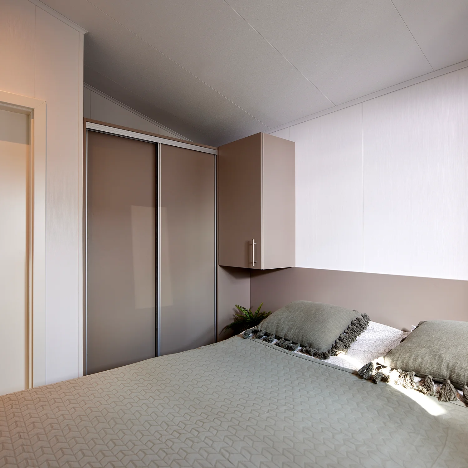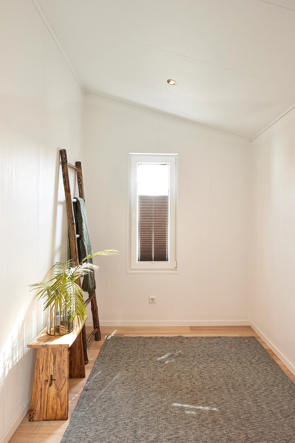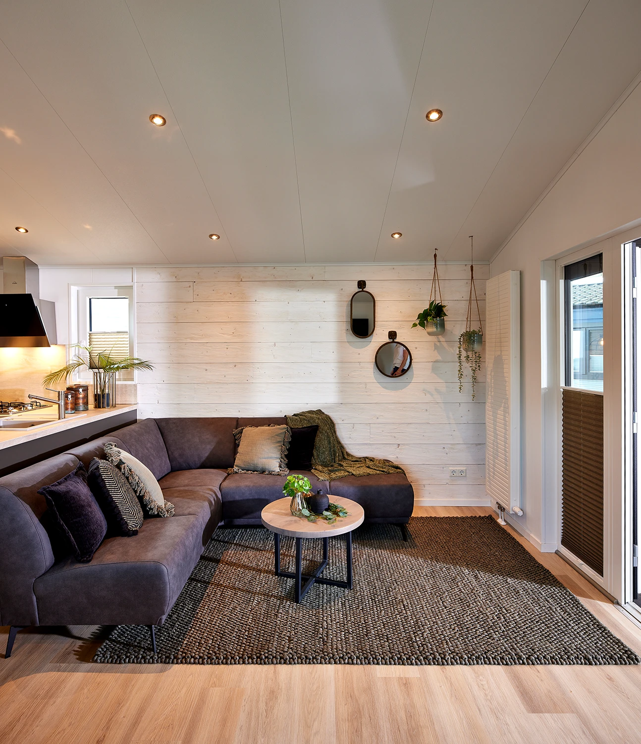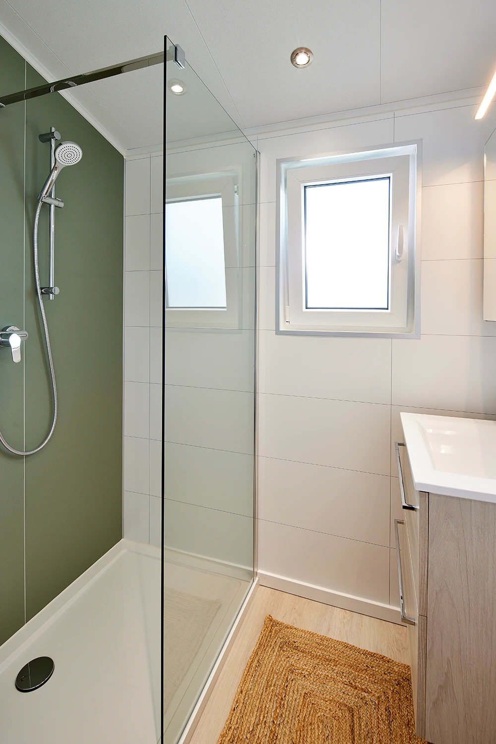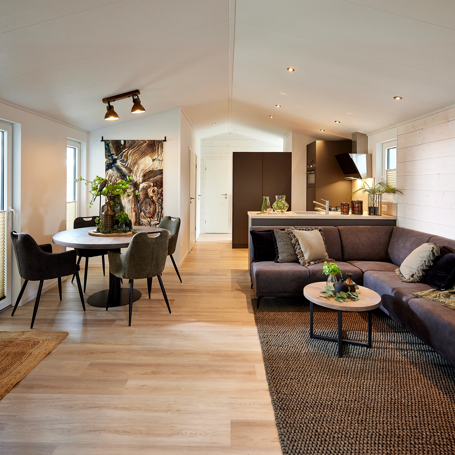 Het model van 50 m² maakt niet alleen indruk met zijn grootte, maar ook met zijn inrichting die is ontworpen met het oog op duurzaamheid, gezelligheid en functionaliteit. De focus ligt op de open woon- en eetruimte met grote ramen, een heldere indeling en een warm, tijdloos kleurenschema. De keuken is royaal opgezet, met veel werkruimte, moderne apparatuur zoals een afzuigkap zonder kop en een compacte magnetron - ideaal voor dagelijks koken of gezellige avonden met familie en vrienden. Twee volledig uitgeruste slaapkamers - een met een tweepersoonsbed, de andere met twee eenpersoonsbedden - bieden een gezellig toevluchtsoord. De badkamer heeft een hoogwaardige inrichting en wordt functioneel aangevuld door het extra toilet. Efficiënte verwarming, robuuste isolatie en een duurzame kunststof gevel maken het model het hele jaar door bewoonbaar - met minimaal onderhoud. Het totaalconcept wordt afgerond door het overdekte terras, dat de leefruimte stijlvol uitbreidt naar de buitenlucht.