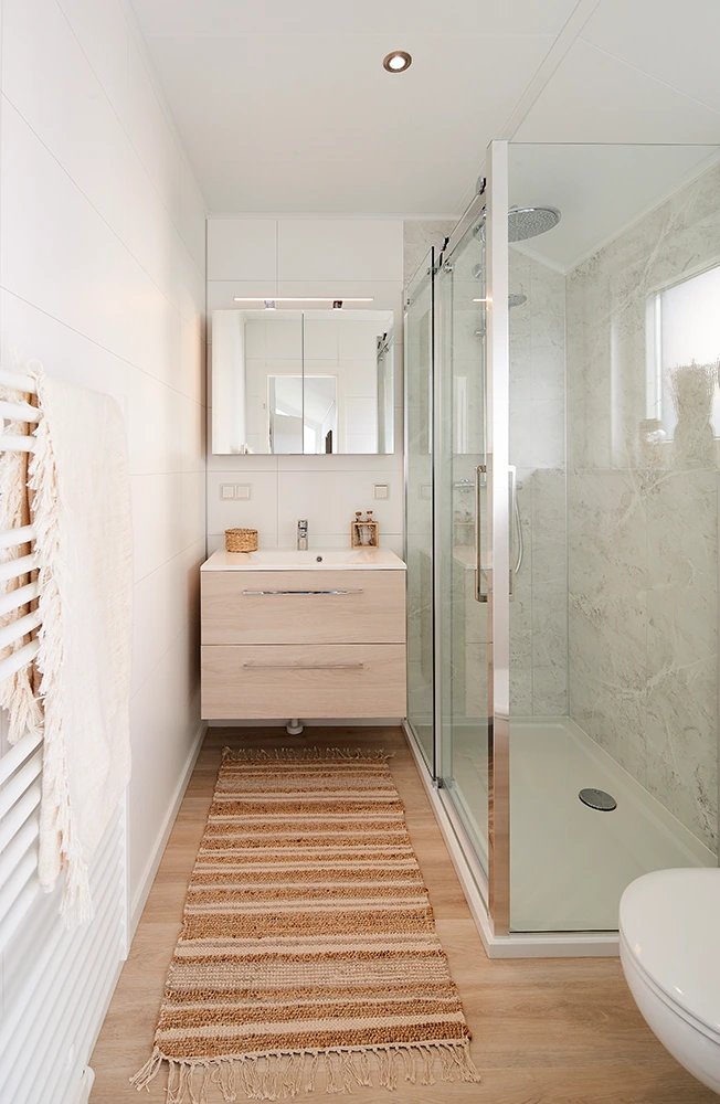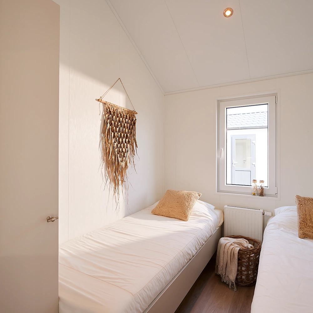 De grote slaapkamer biedt een comfortabel toevluchtsoord met een tweepersoonsbed, nachtkastjes en een ruim wandmeubel. Natuurlijke kleuren en een minimalistisch ontwerp zorgen voor rust en evenwicht. De tweede slaapkamer is ideaal voor gasten of kinderen en beschikt over slimme opbergoplossingen. De moderne badkamer met regendouche en hoogwaardige materialen creëert een kleine wellness retraite voor het dagelijks leven. Het ruimteconcept wordt aangevuld door een praktische entree met opbergruimte voor jassen, schoenen of uitrusting - vooral handig in het koude seizoen. Hoogwaardige isolatie zorgt voor behaaglijke warmte, zelfs in de winter. Een robuuste kunststof gevel en het stabiele schuine dak garanderen duurzaamheid, terwijl talloze ontwerpopties maatwerk mogelijk maken - van de plattegrond tot de inrichting. Maak van de LACET Taifun stacaravan je persoonlijke thuis.