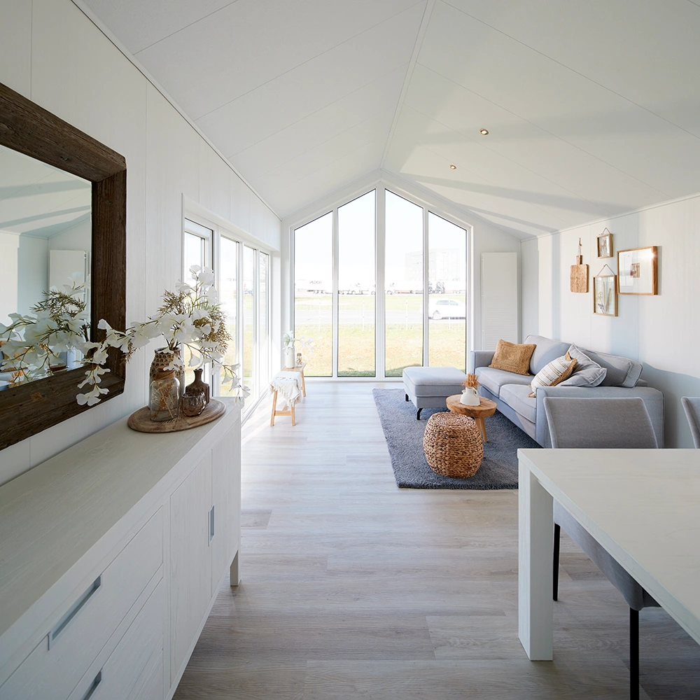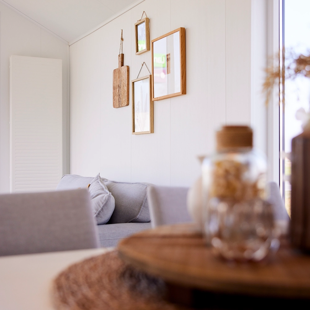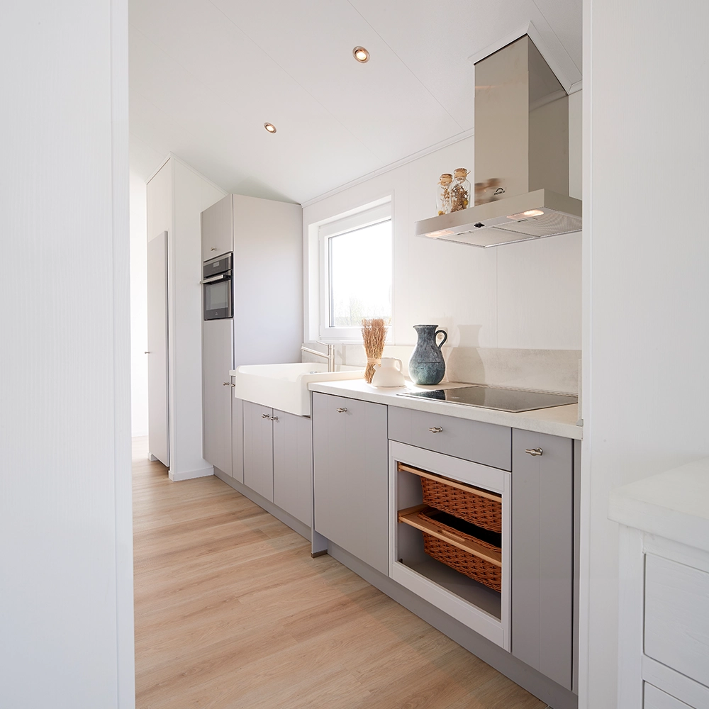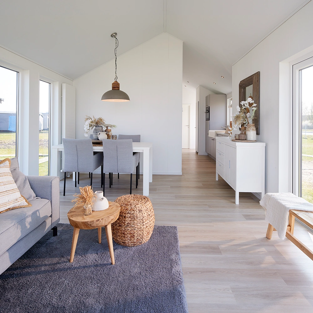 De LACET Taifun stacaravan verenigt modern design en architectonisch verfijnde ruimtelijke harmonie. Hoge ramen van vloer tot plafond laten veel natuurlijk licht binnen en creëren een vloeiende verbinding tussen binnen en buiten en een open, ruime woonsfeer. Of het nu een vakantiehuis is of een toekomstige pensioenresidentie: Taifun biedt een stijlvolle leefruimte die esthetiek en functionaliteit combineert. Centraal staat de open woon- en eetruimte, die een plek is voor gezellige avonden samen, rustige leessessies of sociale bijeenkomsten. De aangrenzende keuken maakt indruk met zijn hoogwaardige apparatuur: kookplaat, koel-vriescombinatie, compacte magnetron en vaatwasser laten niets te wensen over. Een gezellige zithoek en een ruime eethoek maken het hart van de stacaravan compleet.
